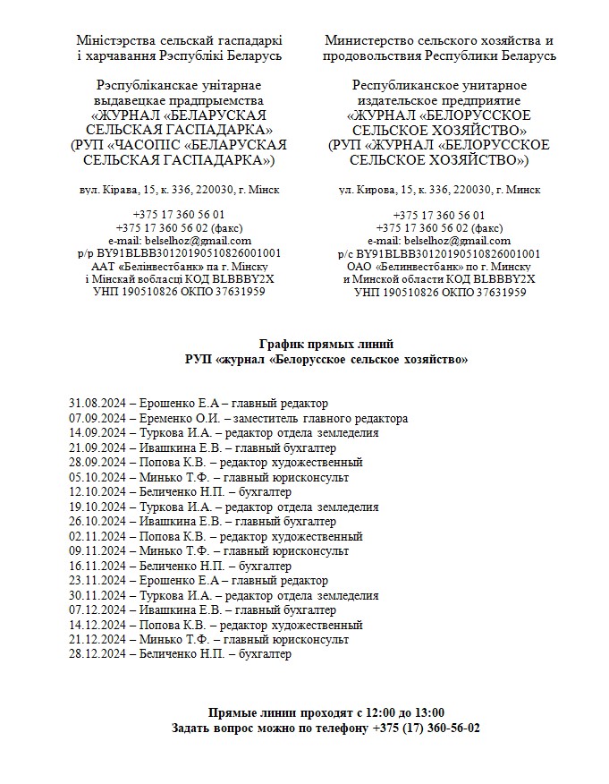 Министерство сельского хозяйства и продовольствия Республики Беларусь, 220030, г.Минск, ул. Кирова, 15.